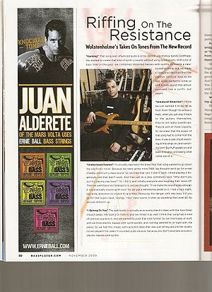 An interview with Christopher Wolstenholme in the November 2009 issue of Bass Guitar Magazine (Author - Bryan Beller). The text apparently skips around to different pages for who knows what reason. There are references as to what section to go to continue on with reading the desired section.