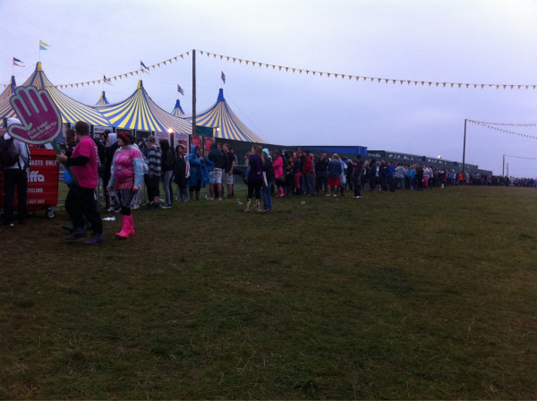 Queue outside the arena, the morning before Muse's 2011 Leeds Festival headline slot. Reaching the barrier usually requires an early arrival.