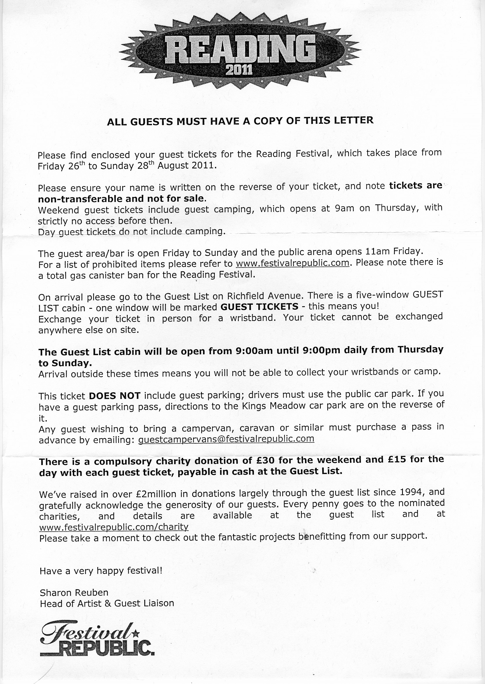Letter which which accompanied guest tickets for Reading Festival 2011.