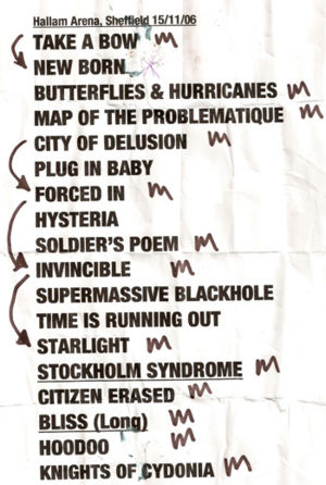 After New Born, Howard said "Thank you Sheffield, thank you very much". Before Soldier's Poem, "This one's for all the lighters and mobile phones". After Supermassive Black Hole, "Thank you very much Sheffield".